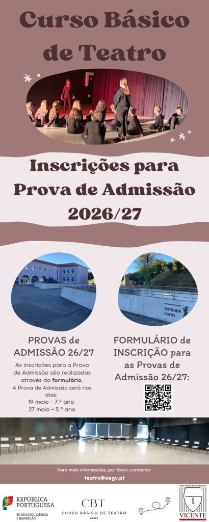 AGRUPAMENTO DE ESCOLAS GIL VICENTE OFERTA DO AGRUPAMENTO - DIVULGAÇÃO Provas de Admissão ao Curso Básico de Teatro para o ano letivo 2026/27 Link para o formulário: https://forms.gle/ewnPbyGeHkqbjcJ58Data da publicação: 28 abril 2026